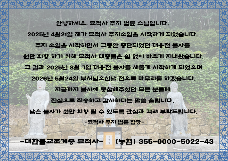 - 이전글[마감]선망가족 추석 합동차례 및 천도재=10월6일(음.8.15)월요일 오전10시30분 25.08.22